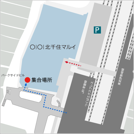 *東京メトロ日比谷線・千代田線,JR常磐線「北千住」の西口改札から、西口エレベーターで2階へ行き、ペデストリアンデッキからマルイ2F入口に続きます(地図の青い点線)